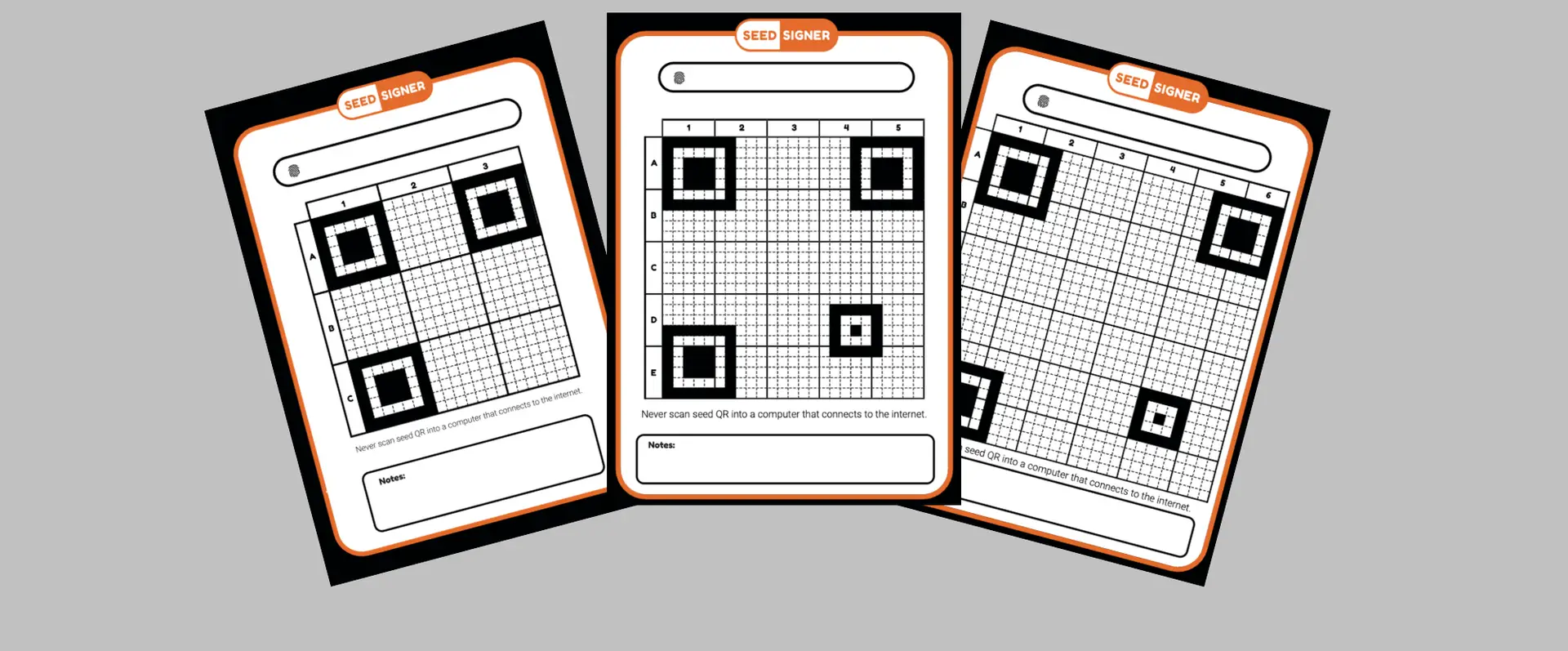 Pack of five SeedQR cards, each measuring 9 cm × 6.5 cm. Designed as an affordable way to back up your seed phrase in QR format, each card also includes space on the back for a written seedphrase.